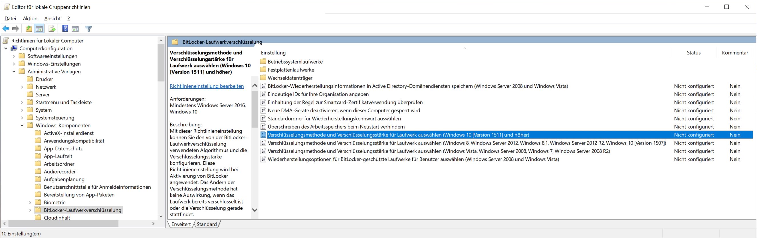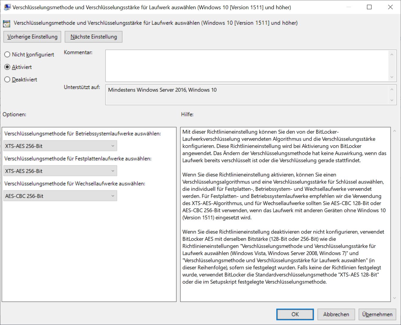 Wenn Sie diese Richtlinieneinstellung aktivieren, können Sie einen Verschlüsselungsalgorithmus und eine Verschlüsselungsstärke für Schlüssel auswählen, die individuell für Festplatten-, Betriebssystem- und Wechsellaufwerke verwendet werden. Für Festplatten- und Betriebssystemlaufwerke empfehlen wir die Verwendung des XTS-AES-Algorithmus, und für Wechsellaufwerke sollten Sie AES-CBC 128-Bit oder AES-CBC 256-Bit verwenden, wenn das Laufwerk mit anderen Geräten ohne Windows 10 (Version 1511) eingesetzt wird.
