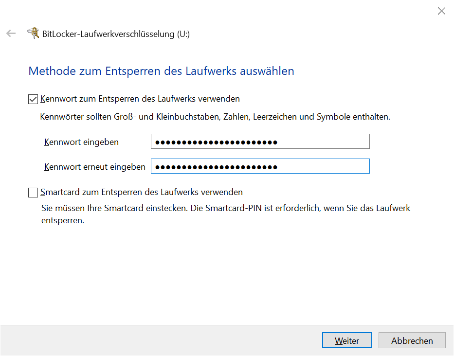 Kennwort zum Entsperren des Laufwerks verwenden → Kennwörter eingeben → Weiter: