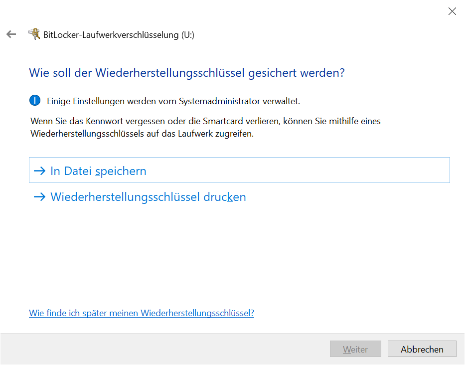 Wie soll der Wiederherstellungsschlüssel gesichert werden: In Datei speichern oder Wiederherstellungsschlüssel drucken → Weiter: