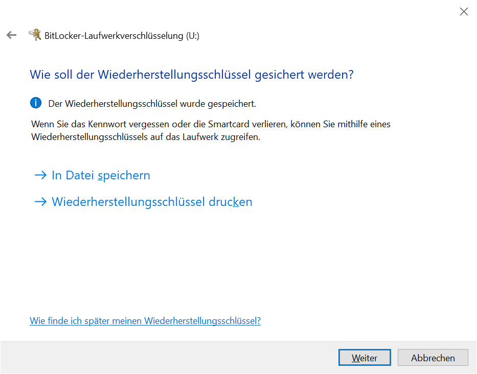Nach „In Datei speichern“: Der Wiederherstellungsschlüssel wurde gespeichert/gedruckt → Weiter: