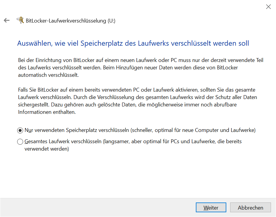 Auswählen, wie viel Speicherplatz des Laufwerks verschlüsselt werden soll: Nur verwendeten Speicherplatz verschlüsseln (bei leeren Laufwerken), Gesamtes Laufwerk verschlüsseln (für Laufwerke, die bereits Daten enthalten) → Weiter: