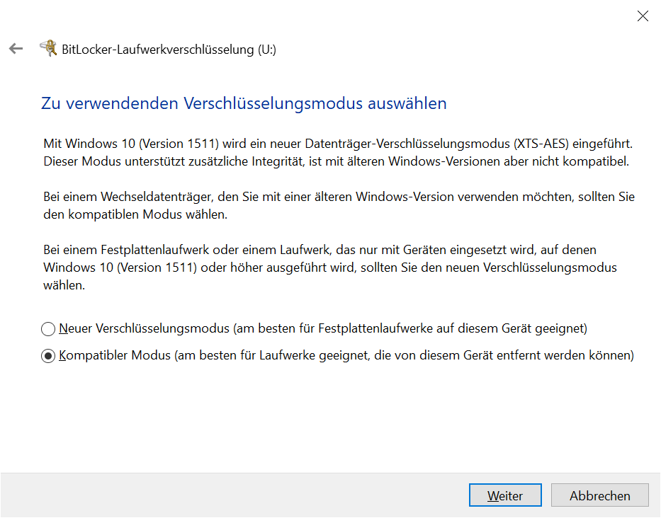 Zu verwendeten Verschlüsselungsmodus auswählen: Kompatibler Modus → Weiter: