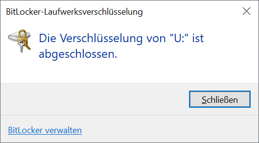 Die Verschlüsselung von „U:“ ist abgeschlossen → Schließen: