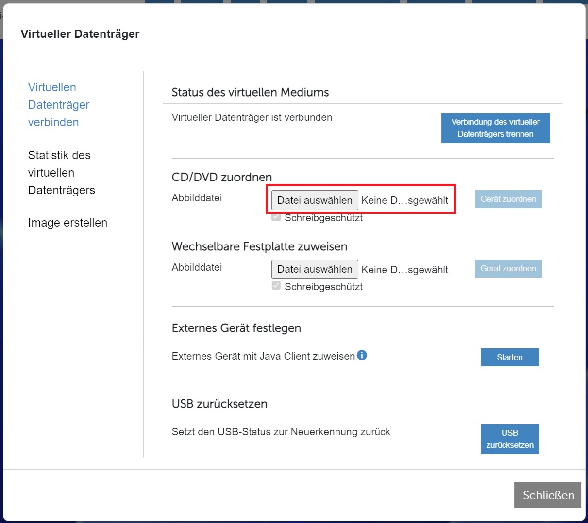 In der „Virtuellen Konsole“ auf „Virtueller Datenträger“ klicken: