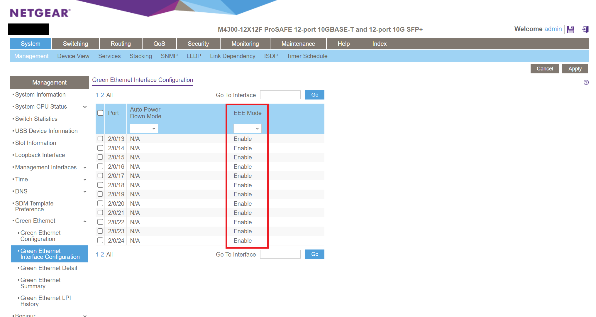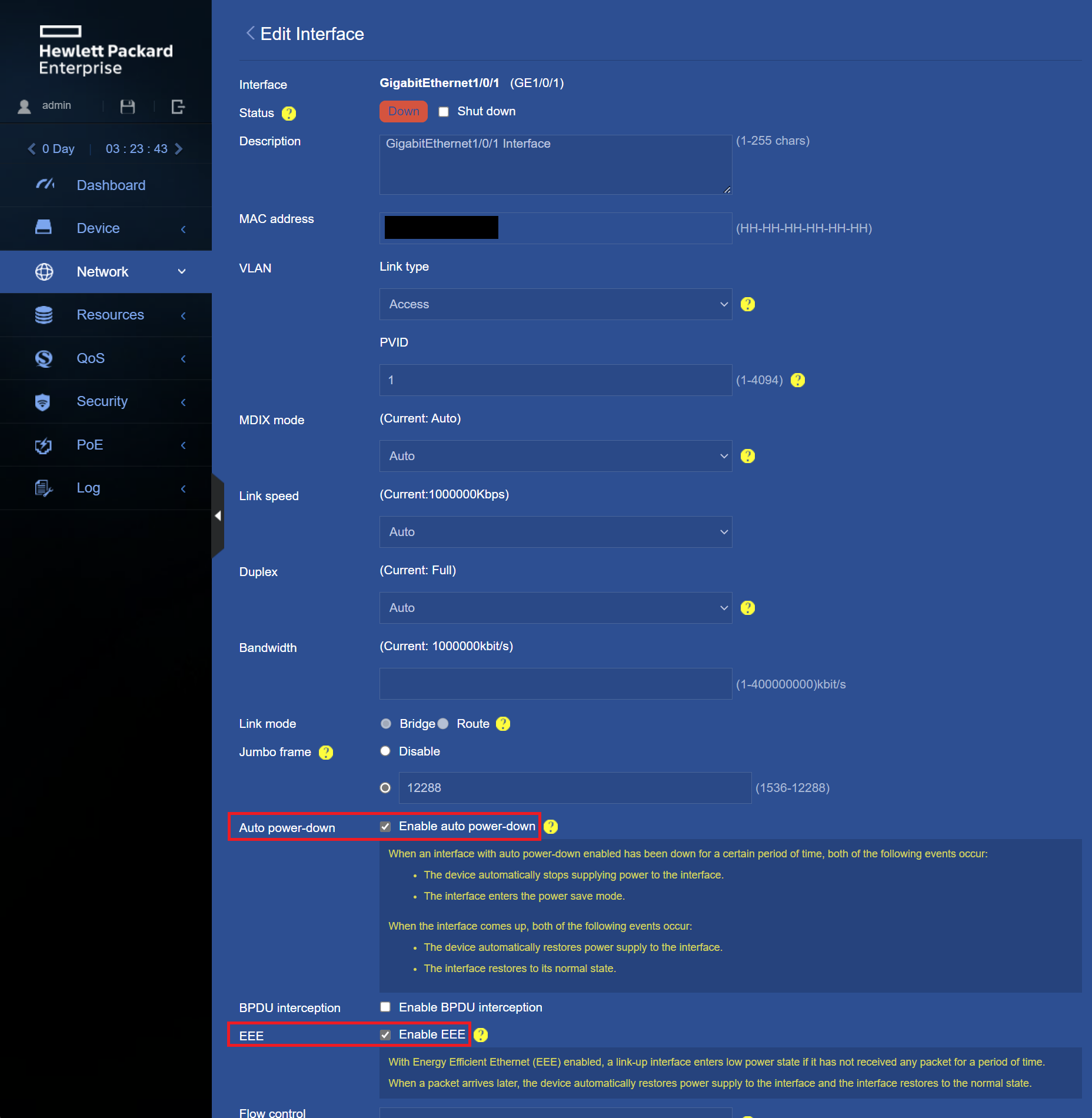 Green Ethernet Interface Configuration → Auto Power Down und EEE aktivieren