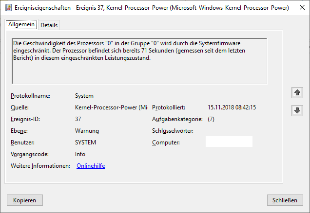 Die Geschwindigkeit des Prozessors „0“ in der Gruppe „0“ wird durch die Systemfirmware eingeschränkt. Der Prozessor befindet sich bereits 71 Sekunden (gemessen seit dem letzten Bericht) in diesem eingeschränkten Leistungszustand.