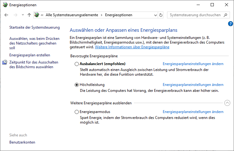 Systemsteuerung → Energieoptionen: Bevorzugte Energiesparpläne → Höchstleistung auswählen
