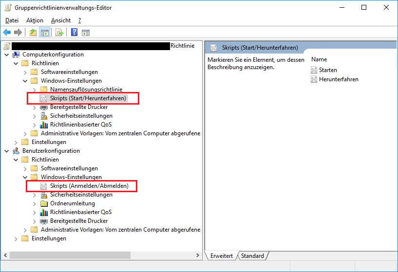 In Domänenumgebungen können Scripts bei Start/Herunterfahren oder Anmelden/Abmelden des Benutzers ausgeführt werden: