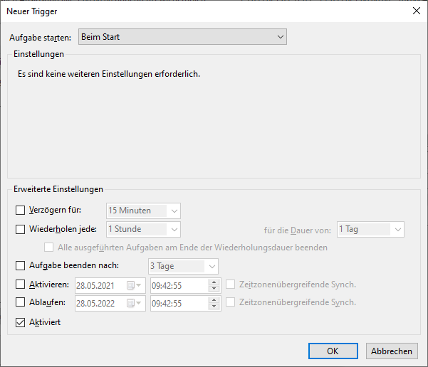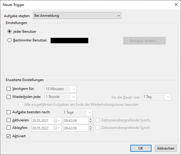 In der Windows Aufgabenplanung eine neue Aufgabe erstellen und das Programm oder Script über den Aufgaben-Trigger bei Windows-Start oder nach Benutzeranmeldung ausführen lassen: