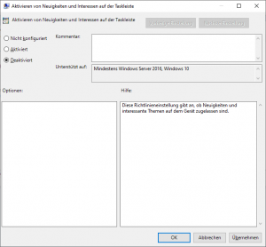 Computerkonfiguration → Administrative Vorlagen → Windows Komponenten → Neuigkeiten und interessante Themen → Aktivieren von Neuigkeiten und Interessen auf der Taskleiste → Deaktiviert, lässt die neue Funktion wieder vollständig verschwinden: