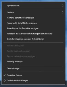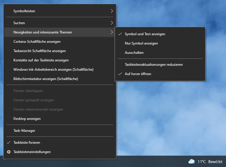 Mit einem Rechtsklick auf die leere Taskleiste, lässt sich die Symbol/Text-Anzeige und das Verhalten von „Neuigkeiten und interessante Themen“ anpassen. Wer die neue Funktion nicht nutzen möchte, kann das Symbol mit „Ausschalten“ wieder aus der Taskleiste entfernen.