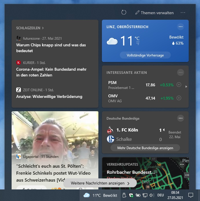 Nach der Installation der aktuellen Windows Updates erscheint in der Windows 10 Taskleiste ein Wettersymbol mit Wetterinfo. Mit einem Klick darauf öffnet sich Neuigkeiten und interessante Themen, ein Mix aus Schlagzeilen, Wetter, Aktien, Sportergebnissen, Verkehrsupdates und anderem: