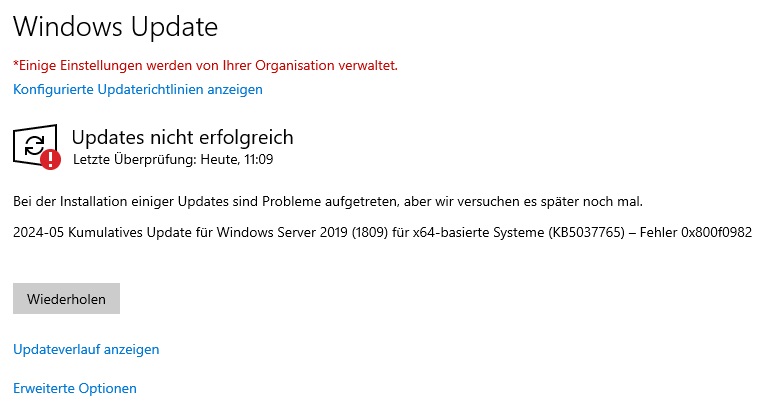 „2024-05 Kumulatives Update für Windows Server 2019 (1809) für x64-basierte Systeme (KB5037765) – Fehler 0x800f0982“ durch Installation des englischen Sprachpakets beheben.